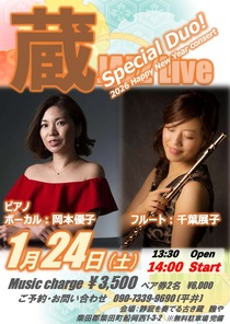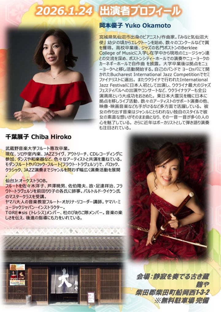 ジャズピアニストの岡本優子さん&フルート奏者の千葉展子さんによる新春ジャズデュオライブを開催いたします。フルートは クラシックにもジャズにもとても相性が良い魅力的な楽器。フルートの多彩な響きをお楽しみください♪