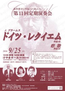 みやぎコーラルハーモニーは、レクイエム、ミサ曲、オラトリオ等の合唱の名曲を、オーケストラとともに演奏する混声合唱団です。今回は、J.ブラームス「ドイツ・レクイエム」と「悲歌」を指揮:渡部勝彦、合唱:みやぎコーラルハーモニー、管弦楽:エマイユ・フィルハーモニック、ソプラノ:渡部ジュディス、バリトン:高橋正典で演奏します。