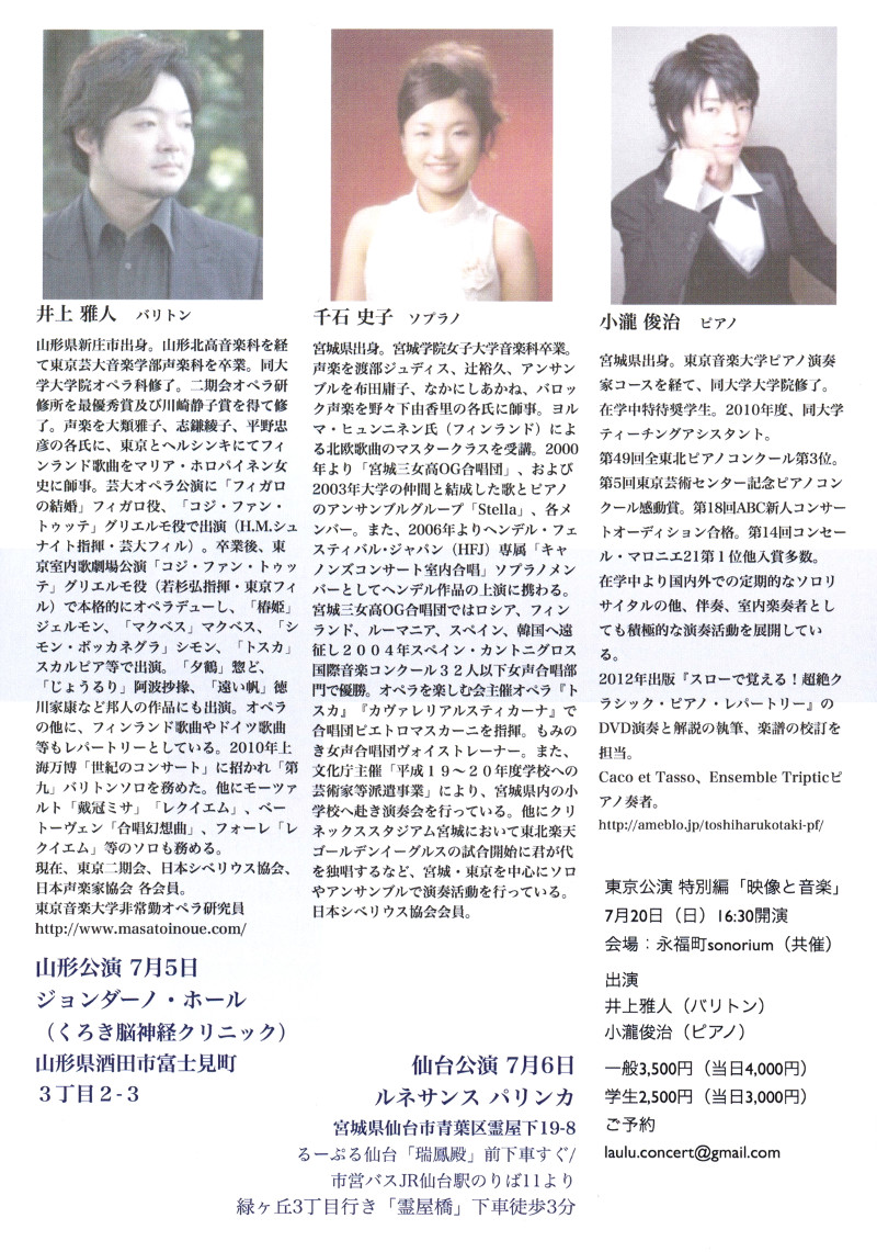 天満敦子、佐野成宏、村治佳織や小山実稚恵といった一流の音楽家を仙台に招きコンサートを主催する他、仙台で開催されるコンサート情報や音楽家のご紹介を始めとして仙台のクラシック音楽ファンを広くサポートして参ります。