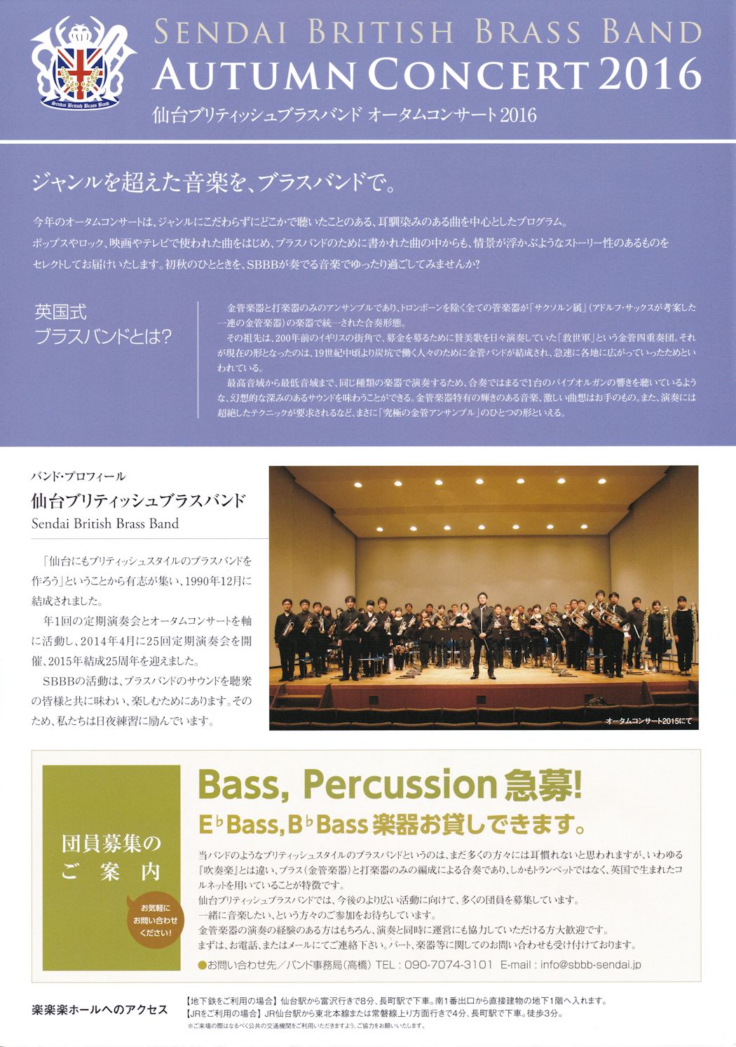 仙台ブリティッシュブラスバンド(Sendai British Brass Band, SBBB)は1990年12月に結成され、仙台を中心に活動しているブリティッシュスタイルの金管バンドです。オータムコンサート2016では、ダウントン・アビーのテーマ J.ルン 作曲、ファイナル・カウントダウン J.テンペスト 作曲、ホーコン善王の伝説 P.スパーク 作曲 他を披露します。