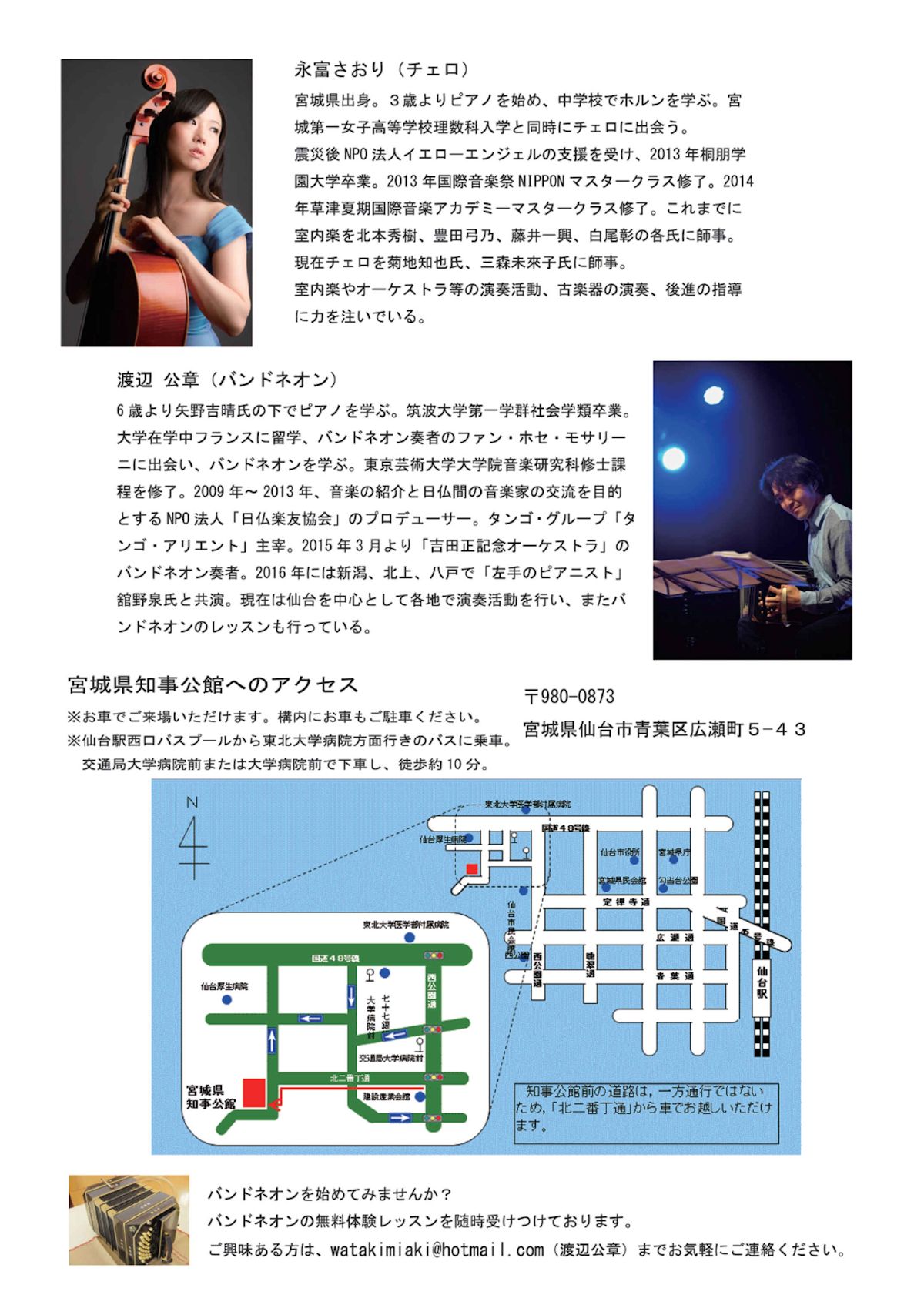 TOP > 仙台・コンサート情報掲示板 > ♪新緑コンサート2017 チェロとバンドネオン