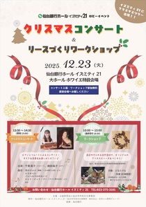 イズミティ21大ホールのホワイエを会場に、泉区内の自然素材を利用したクリスマスリースづくりのワークショップとピアノ・フルートによるクリスマスコンサートを行います。