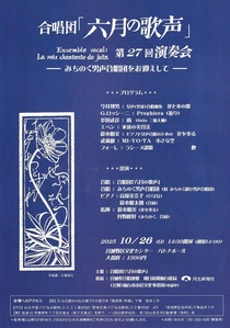小人数の女声合唱団、合唱団「六月の歌声」の4年半ぶりの演奏会です。今回は青森から男声アンサンブルであるみちのく男声合唱団をゲストに迎え、」女声、男声、混声と多彩なプログラム構成で、聴き応えのある合唱音楽をお届けします。
