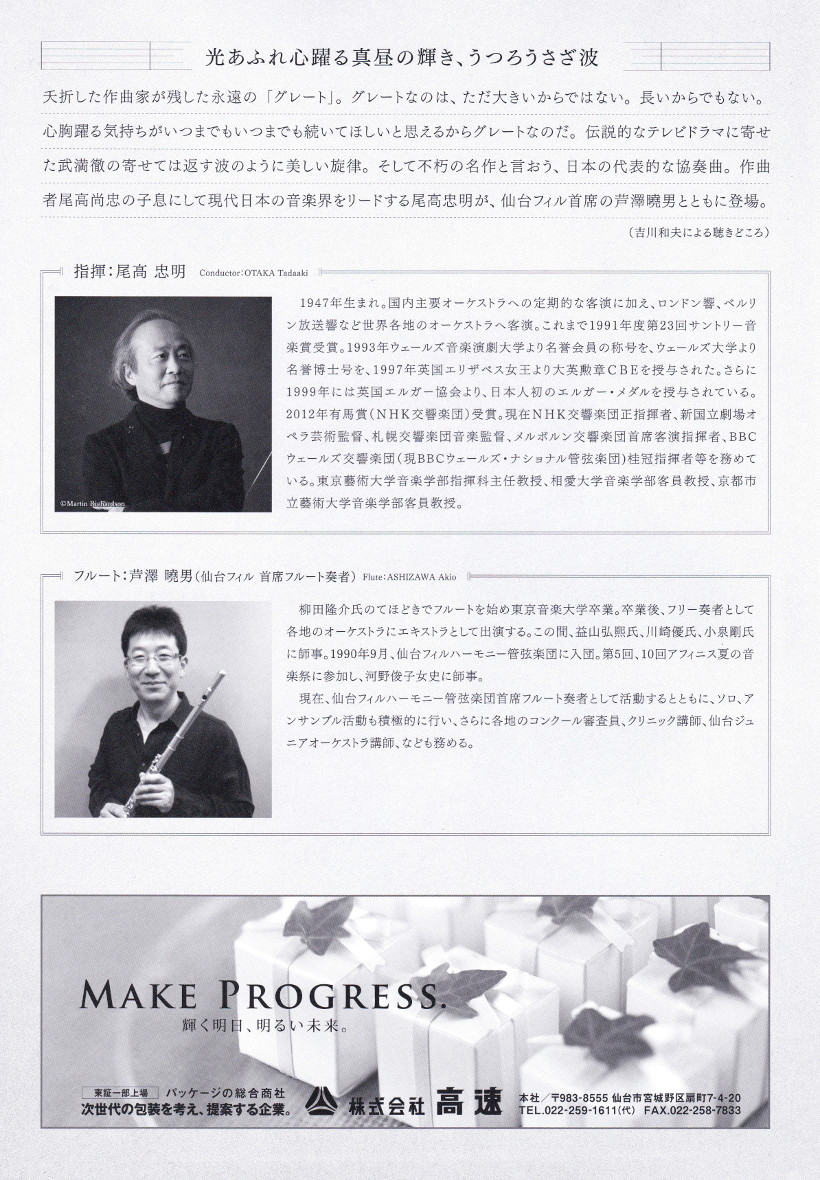 夭折した作曲家が残した永遠の「グレート」。グレートなのは、ただ大きいからではない。長いからでもない。心胸躍る気持ちがいつまでもいつまでも続いてほしいと思えるからグレートなのだ。伝説的なテレビドラマに寄せた武満徹の寄せては返す波のように美しい旋律。そして不朽の名作と言おう、日本の代表的な協奏曲。作曲者尾高尚忠の子息にして現代日本の音楽界をリードする尾高忠明が、仙台フィル首席の芦澤曉男とともに登場。