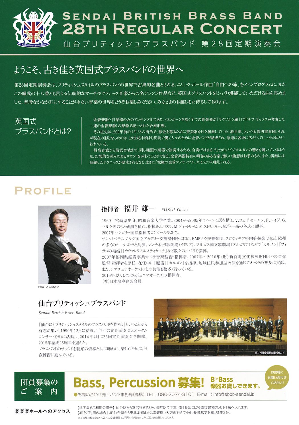 第28回定期演奏会は,ブリティッシュスタイルの世界で古典的名曲とされる,エリック・ボール作曲「自由への旅」をメインプログラムに,またこの編成の十八番とも言える伝統的なマーチやクラシック音楽からの名アレンジ作品など,英国式ブラスバンドをじっくり堪能していただける曲を集めました.