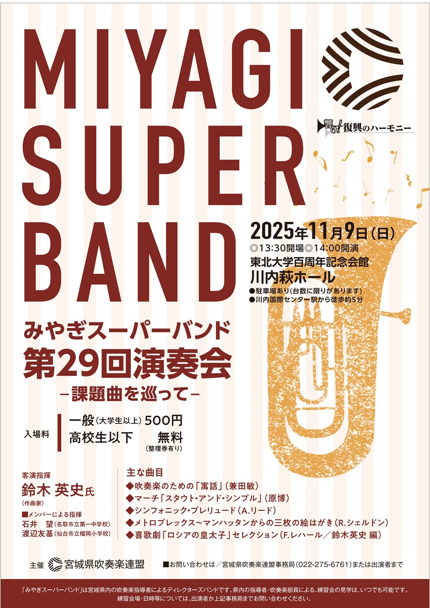 TOP > 仙台・コンサート情報掲示板 > みやぎスーパーバンド第29回演奏会