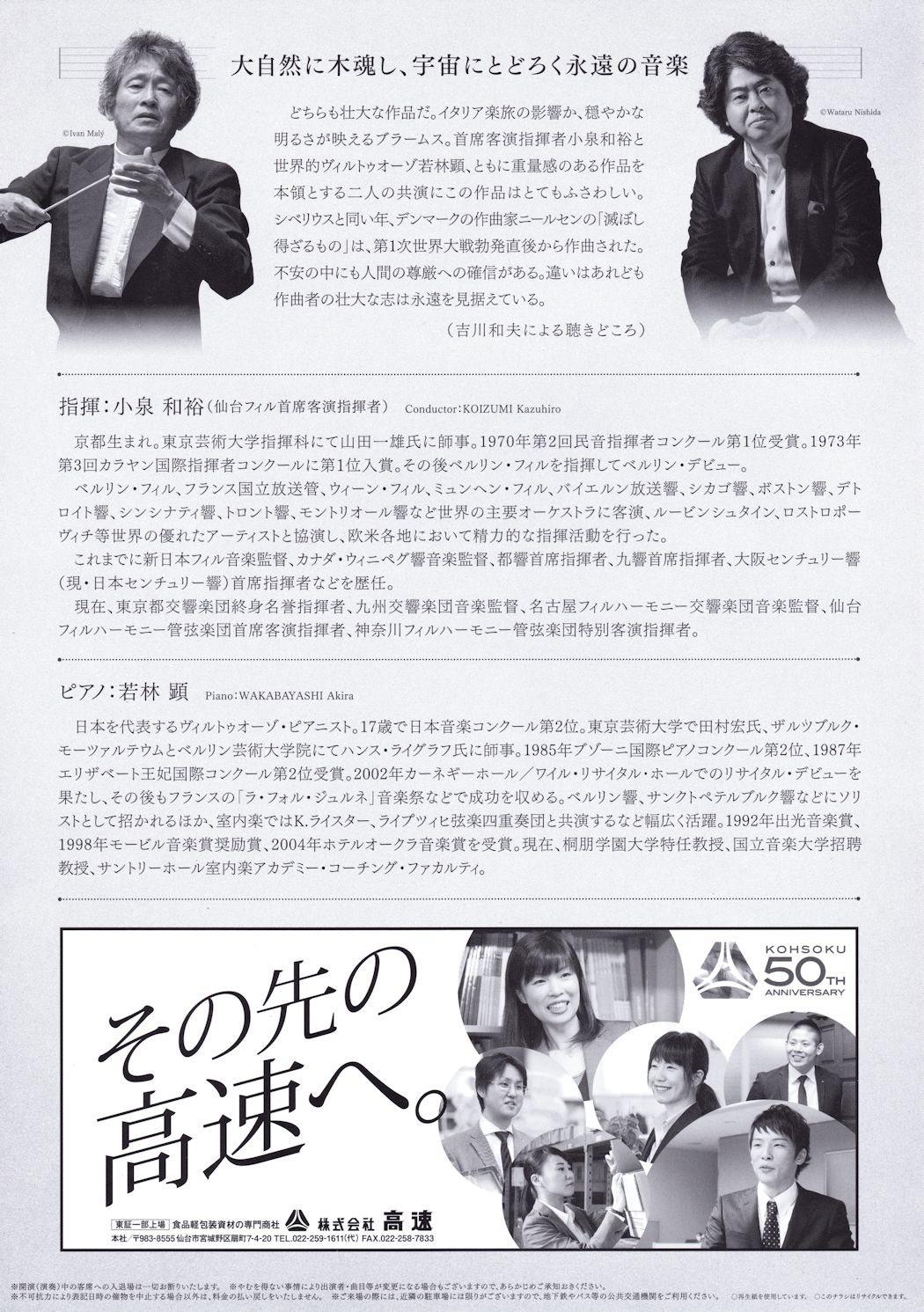 どちらも壮大な作品だ。イタリア楽旅の影響か、穏やかな明るさが映えるブラームス。首席客演指揮者小泉和裕と世界的ヴィルトゥオーゾ若林顕、ともに重量感のある作品を本領とする二人の共演にこの作品はとてもふさわしい。シベリウスと同い年、デンマークの作曲家ニールセンの「滅ぼし得ざるもの」は、第1次世界大戦勃発直後から作曲された。不安の中にも人間の尊厳への確信がある。違いはあれども作曲者の壮大な志は永遠を見据えている。 (吉川和夫による聴きどころ)