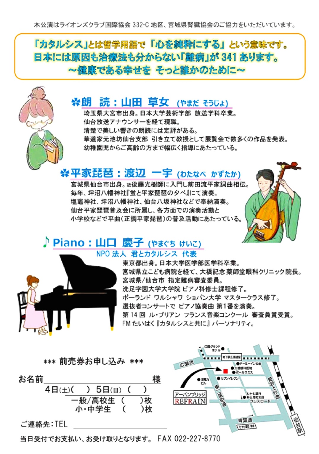 難病を音楽で支援するNPO法人 君とカタルシスが主催する、心が爽やかになる音楽空間「君とカタルシスコンサート」。今回は、平家琵琶の語りと現代語朗読+ピアノをお聴きいただきます。