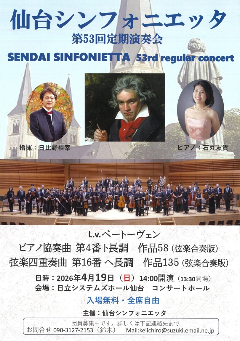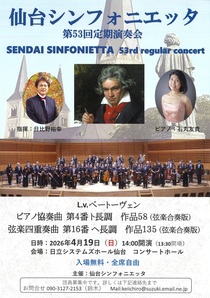 仙台シンフォニエッタは1998年に創立した、弦楽器主体の室内オーケストラです。年二回の定期演奏会を開催しており、前期は弦楽合奏、後期は管楽器の応援を得て交響曲などを演奏しています。第53回定期演奏会は、日比野裕幸の指揮、石丸友貴のピアノで、ベートーヴェン「ピアノ協奏曲第4番卜長調(弦楽合奏版)」と「弦楽四重奏曲第16番 ヘ長調(弦楽合奏版)」ベートーヴェン「ピアノ協奏曲第4番卜長調 作品58(弦楽合奏版)」と「弦楽四重奏曲第16番へ長調(弦楽合奏版)」を取り上げます。