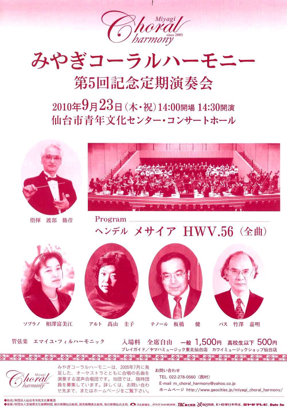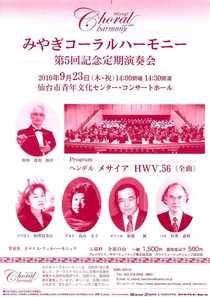 2005年7月に発足した「みやぎコーラルハーモニー」は、レクイエム、ミサ曲、オラトリオ等の合唱の名曲を、オーケストラとともに演奏する混声合唱団です。今回は、オーケストラ(エマイユ・フィルハーモニック)、ソリスト(ソプラノ:相澤富美江 アルト:高山圭子 テノール:板橋健 バリトン:竹澤嘉明)を招き、ヘンデルのオラトリオ「メサイア」全曲を演奏します。