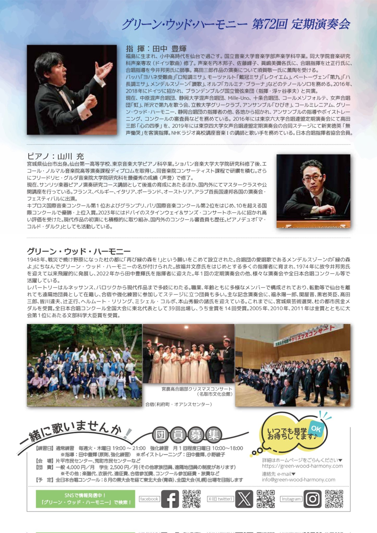 今年はシェーンベルクなどのアカペラステージから始まり、最後は木下牧子作曲「方舟」を演奏いたします。ピアニストに山川充先生を迎え、皆さまにお楽しみいただける演奏にいたします。