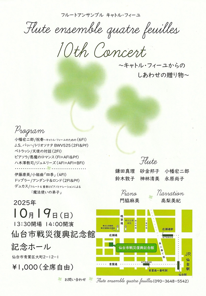 「キャトルフィーユからのしあわせの贈り物」と題し、小幡宏二郎/祝奏~キャトル・フィーユのための、バッハ/トリオソナタ BWV525、ピアソラ/悪魔のロマンス、八木潭教司/ジュエリーズ、伊藤康英/小組曲「四季」、デュカス/フルート6重奏とピアノとナレーションによる「魔法使いの弟子」他をお聴きいただきます。演奏は、フルート:鎌田真理 砂金邦子 小幡宏二郎 鈴木敦子 神林清美 永原尚子、ピアノ:門脇麻美、ナレーション:高梨美紀。
