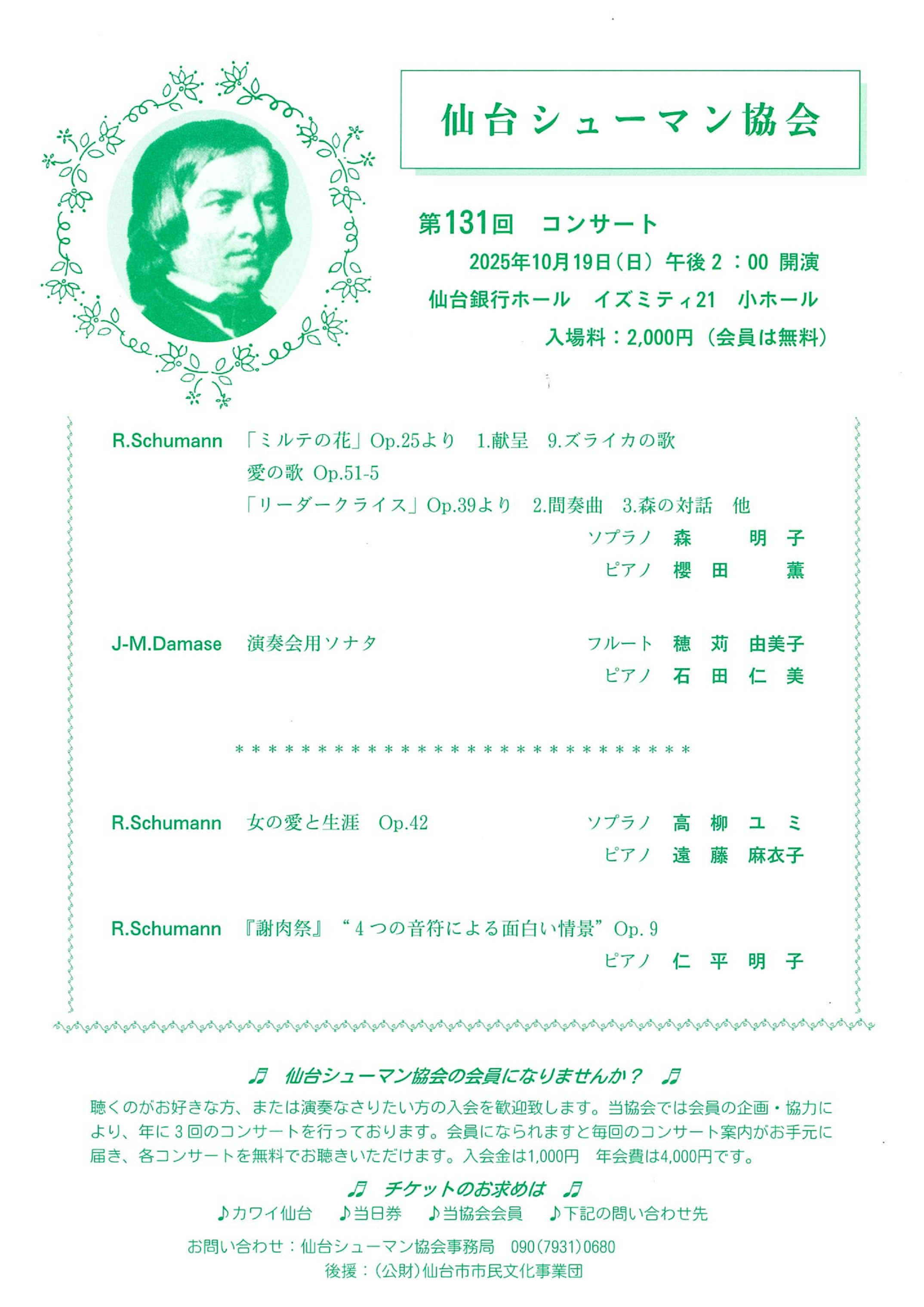 仙台シューマン協会では会員の企画・協力により、1986年から年3回ほどコンサートを行っています。今回は、ピアノ、ソプラノ、フルートによる演奏で、シューマン「リーダークライス」より、「女の愛と生涯」、「謝肉祭」他をお聴きいただきます。
