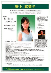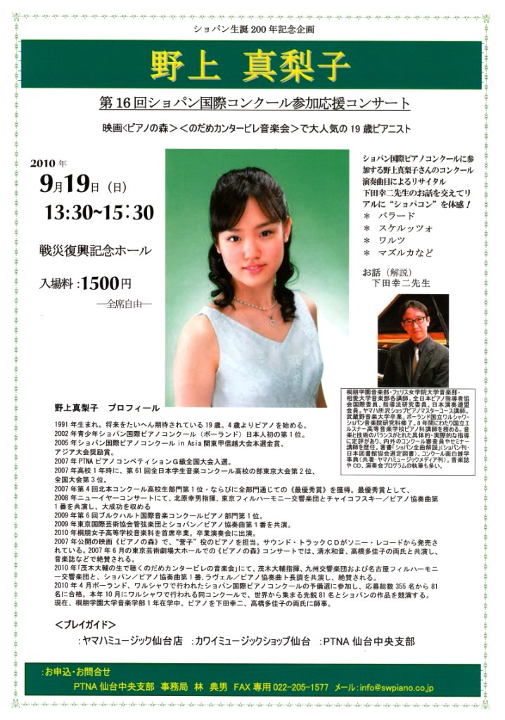 TOP > 仙台・コンサート情報掲示板 > 野上真梨子 第16回ショパン国際コンクール参加応援コンサート