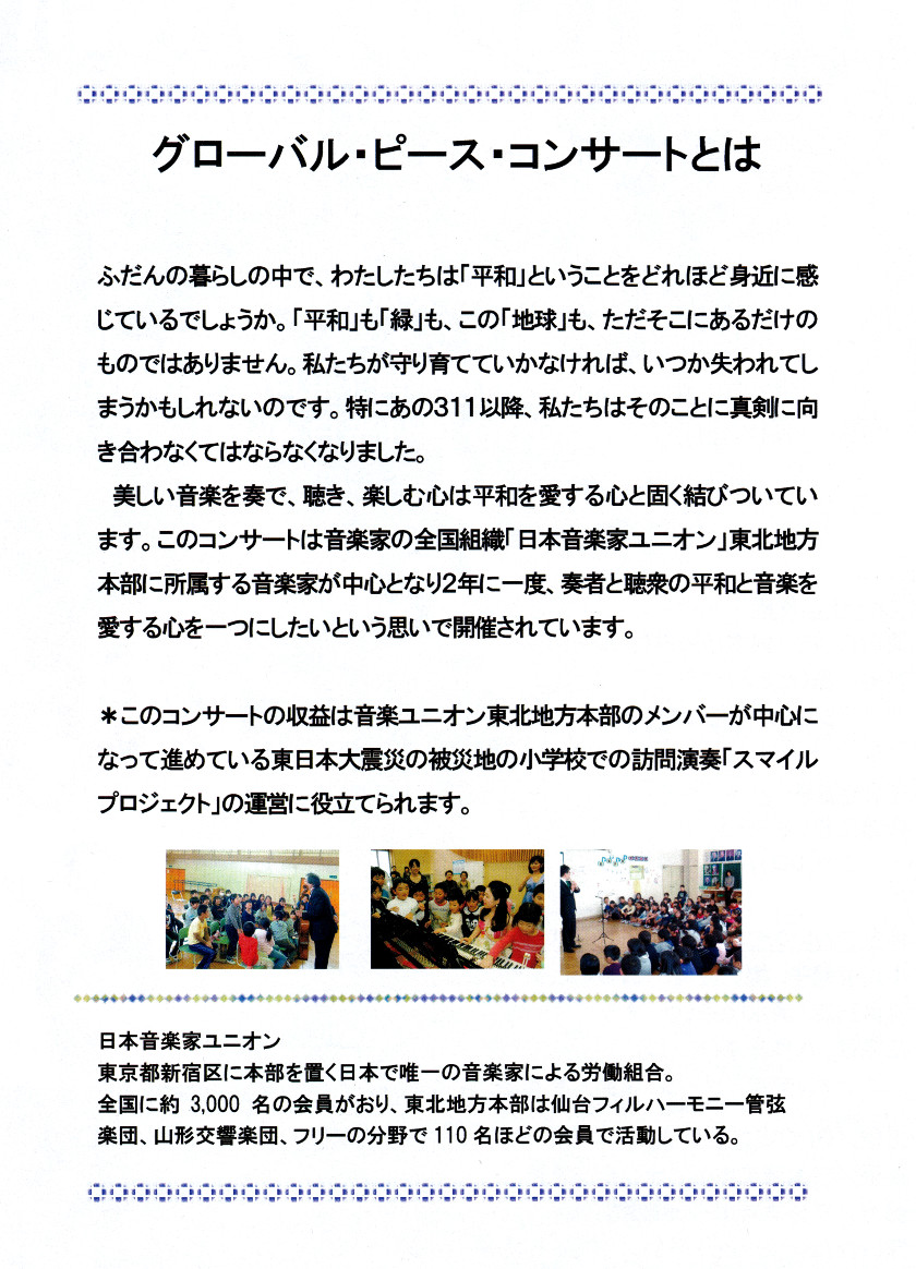 ※このコンサートの収益は音楽ユニオン東北地方本部のメンバーが中心になって進めている東日本大震災の被災地の小学校での訪間演奏「スマイルプロジェクト」の運営に役立てられます。