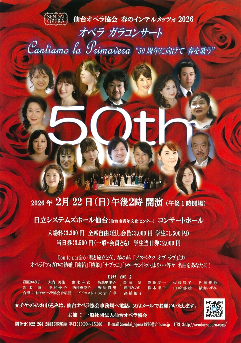 TOP > 仙台・コンサート情報掲示板 > 仙台オペラ協会 春のインテルメッツォ2026 オペラガラコンサート