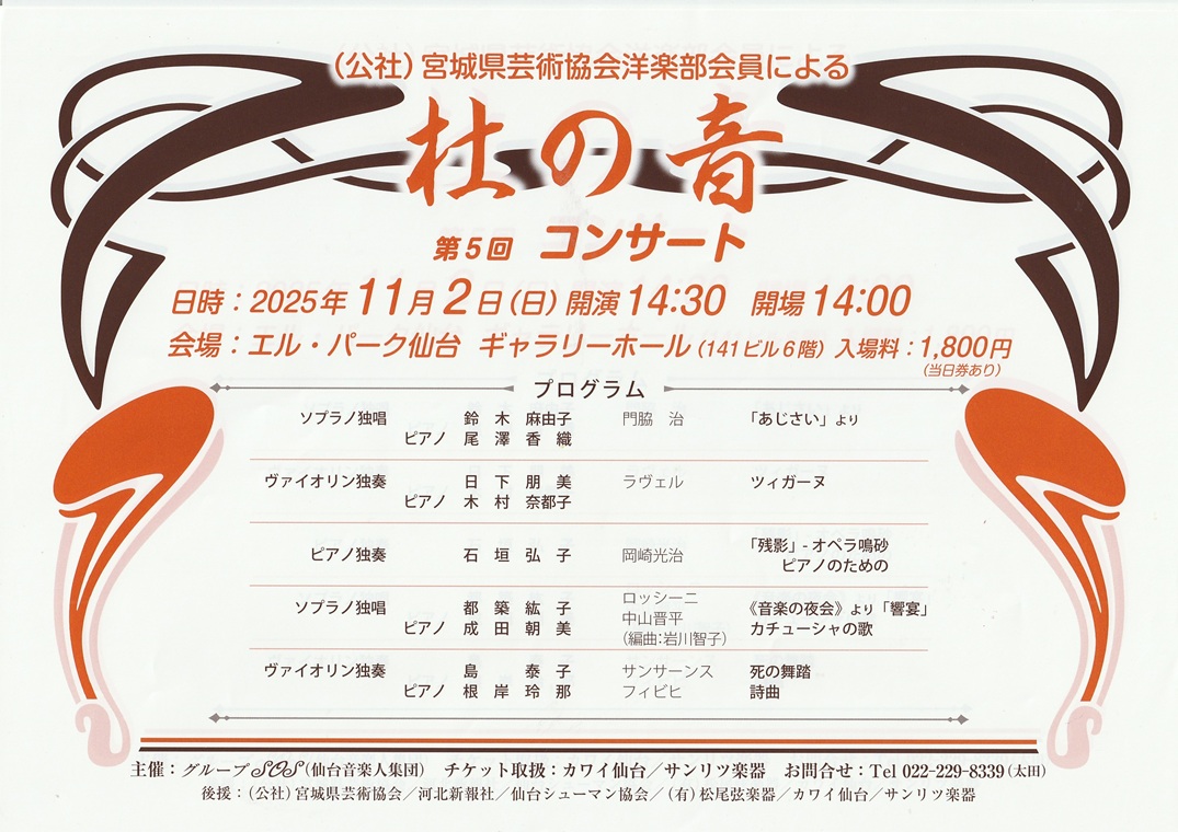 TOP > 仙台・コンサート情報掲示板 > 宮城県芸術協会洋楽部会員による杜の音 第5回コンサート