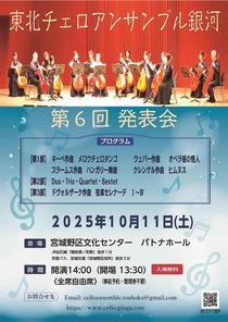 夜空に輝く満天のお星様のように、チェロのアンサンブルを通して煌きたい。東北チェロアンサンブル「銀河」は、東北の地に生まれた新しい音楽の楽しみ方です。今年設立10周年を迎えることとなり、2024年6月の第5回発表会以来、2年ぶりの発表会を開催します。