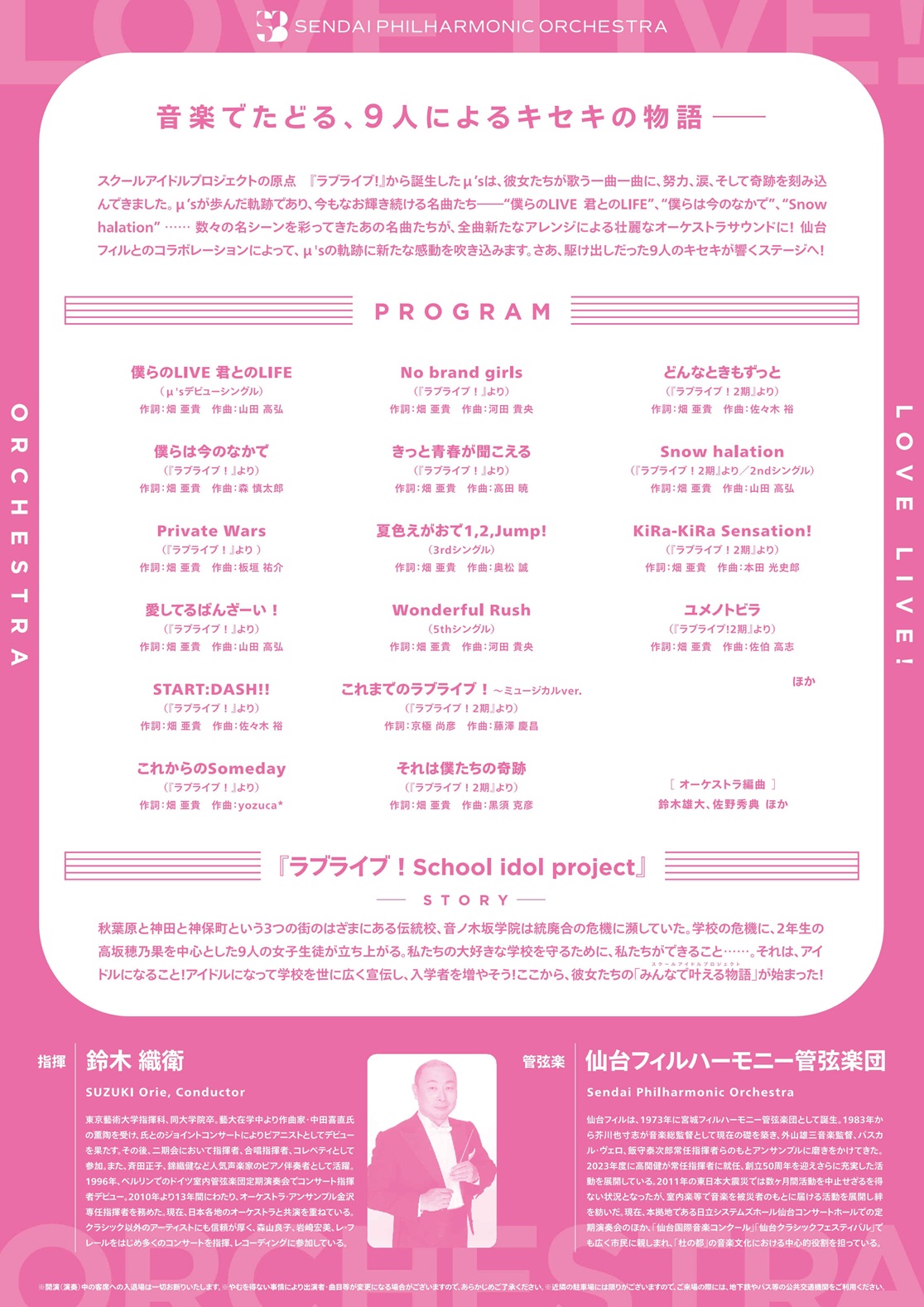 μ'sが歩んだ軌跡であり、今もなお輝き続ける名曲たち――“僕らのLIVE 君とのLIFE”、“僕らは今のなかで”、“Snow halation” …… 数々の名シーンを彩ってきたあの名曲たちが、全曲新たなアレンジによる壮麗なオーケストラサウンドに!仙台フィルとのコラボレーションによって、μ'sの軌跡に新たな感動を吹き込みます。