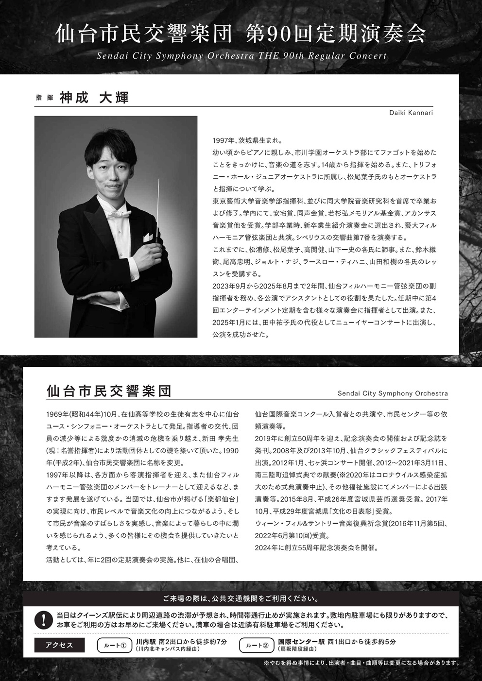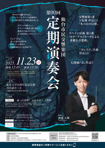 仙台市で活動しているアマチュアオーケストラ仙台市民交響楽団90回目の定期演奏会。神成大輝(前 仙台フィルハーモニー管弦楽団副指揮者)の指揮で、チャイコフスキー 交響曲第1番 ト短調 作品13『冬の日の幻想』、シベリウス『カレリア』序曲、ラフマニノフ 幻想曲『岩』他を演奏します。