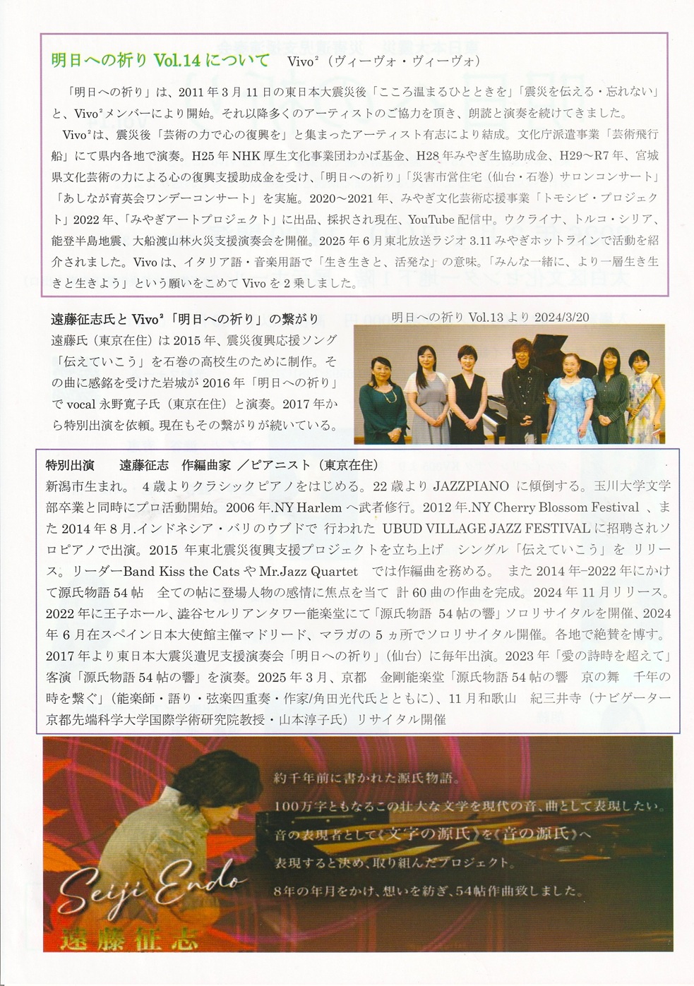 「明日への祈り」は、2011年3月11日の東日本大震災後「こころ温まるひとときを」と、Vivo2メンバーにより開始。多くのアーティストのご協力を頂き、朗読と演奏を続けてきました。2016年からは災害遺児支援を目的として自主公演を開催しています。
