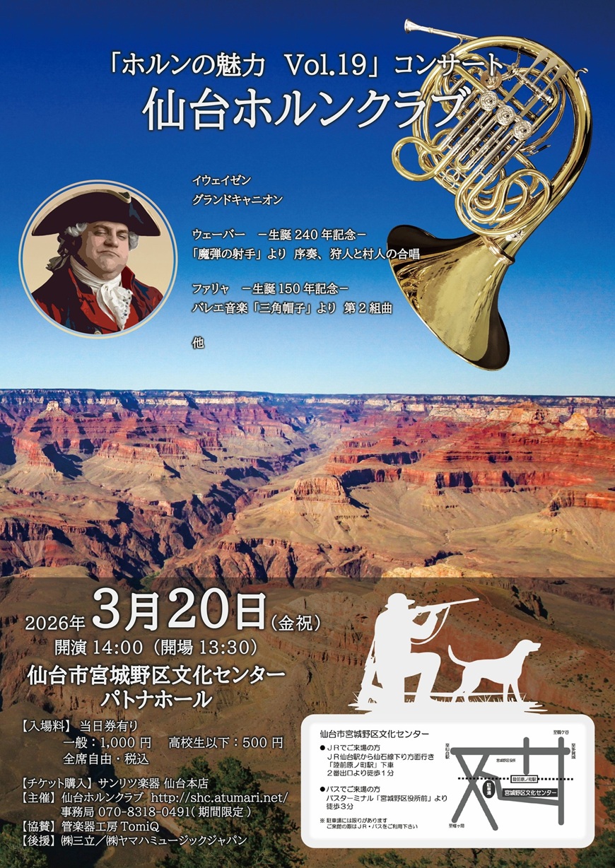 仙台ホルンクラブは、仙台市を中心に活動を行っているホルンアンサンブルです。活動を通じて、ホルンアンサンブルの輪を広げ、その魅力と楽しさを伝えて行きたいと考えています。今回は、イウェイゼン「グランドキャニオン」、ウェーバー「魔弾の射手」より序奏、狩人と村人の合唱、ファリャ バレエ音楽「三角帽子」より第2組曲 他をお聴きいただきます。