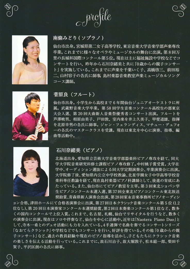 ソプラノ南條みどり、フルート菅原良、ピアノ石川奈緒美によるクラシックトリオコンサート。前半はバロックと古典派、後半はオペラの作品を演奏します。