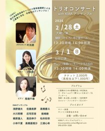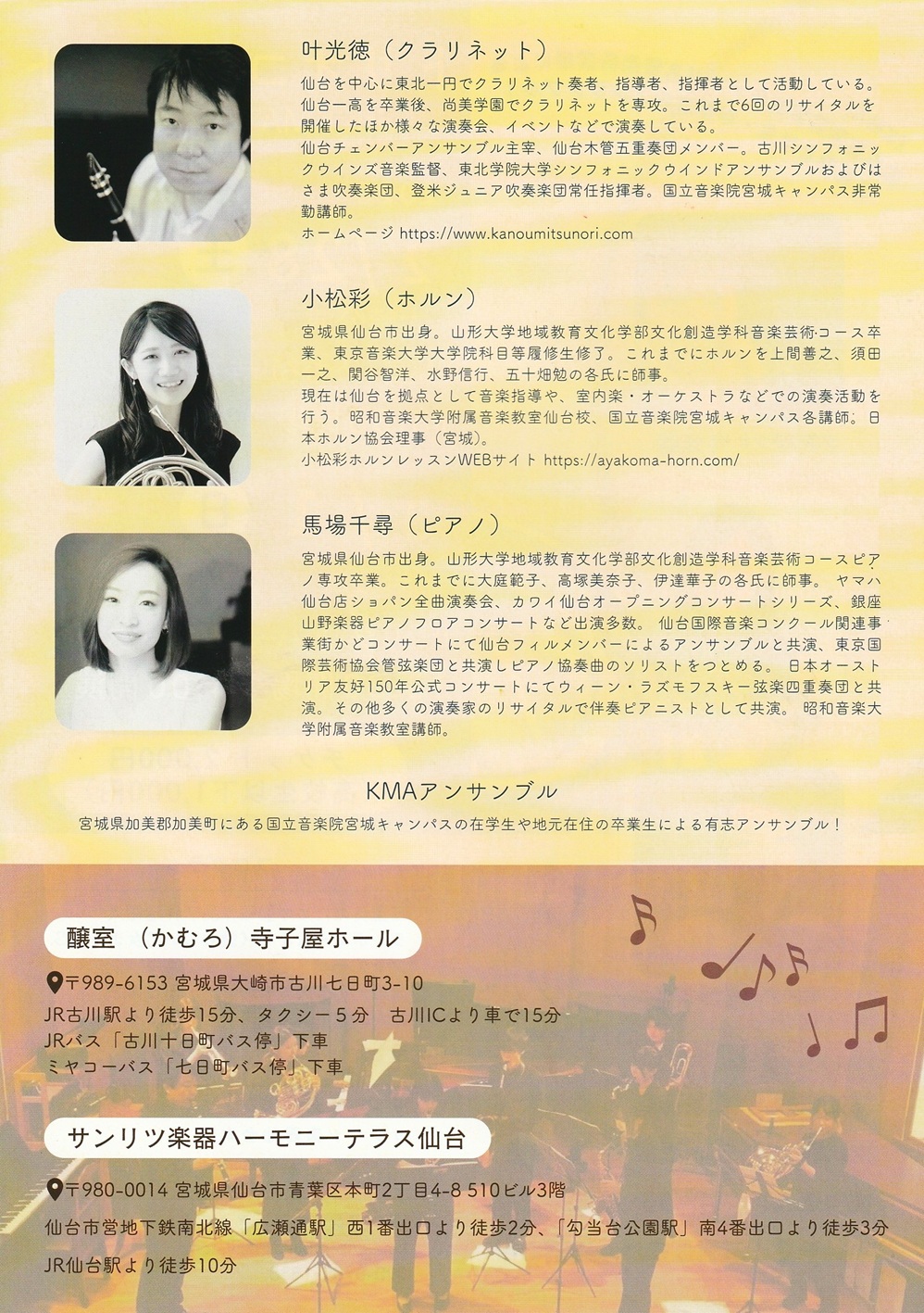 国立音楽院宮城キャンパス管楽器講師によるクラリネット・ホルン・ピアノの三重奏と、学生・卒業生によるアンサンブルコンサート。