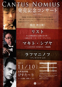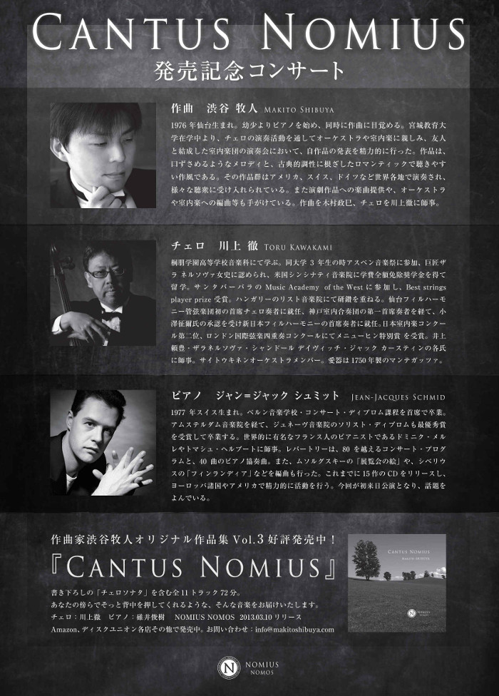 作曲家 渋谷牧人が贈る2013年最高の選曲を、新日本フィルハーモニー首席チェロ奏者 川上徹と、超絶技巧のピアニスト ジャン=ジャック シュミットが仙台初公演! 村上春樹最新作で話題となったリストの「ル・マル・デュペイ」、渋谷牧人の最新CD「CANTUS NOMIUS」収録曲、ラフマニノフのチェロソナタをお聴きいただきます。