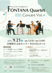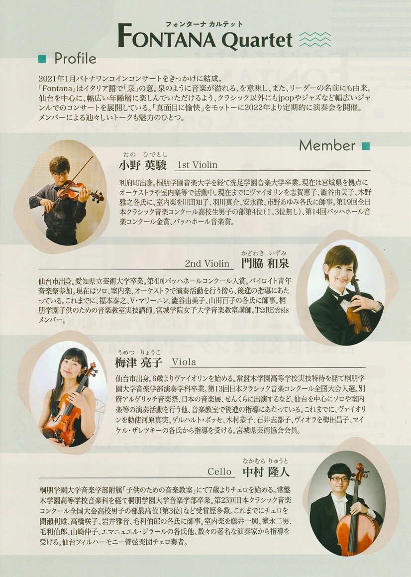 FONTANA Quartet(フォンターナカルテット)は2021年1月パトナ・ワンコインコンサートをきっかけに結成。 「Fontana」はイタリア語で「泉」の意。 泉のように音楽が溢れる、を意味し、また、リーダー門脇和泉の名前にも由来。 仙台を中心に、幅広い年齢層に楽しんで頂けるよう、クラシック以外にもjpopやジャズなど幅広いジャンルでのコンサートを展開している。「真面目に愉快」をモットーに2022年より定期的に演奏会を開催。 メンバーによる辿々しいトークも魅力のひとつ。