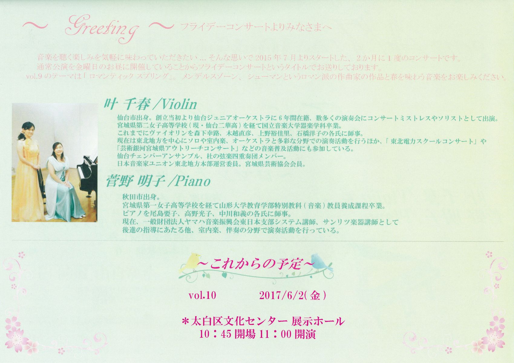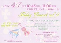 音楽を聴く楽しみを気軽に味わっていただきたい…そんな思いで2015年7月よりスタートした、2か月に1度のコンサートです。通常公演を金曜目のお昼に開催していることからフライデーコンサートというタイトルでお送りしております。 vol.9のテーマは「ロマンティック スプリング」。メンデルスゾーン、シューマンというロマン派の作曲家の作品と春を味わう音楽をお楽しみください。