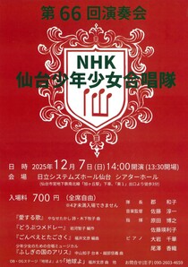 創立66年のNHK仙台少年少女合唱隊が、今年も演奏会を開催します。12月の年の瀬を、小学生から高校生までの子どもたちの歌声で過ごしませんか? 今回は、やなせたかし・木下牧子の「愛する歌」、ミュージカル「ふしぎの国のアリス」などを披露します。