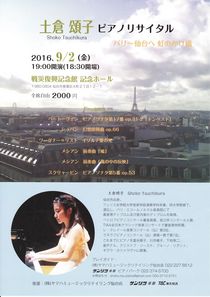 仙台出身で、パリ・エコールノルマル音楽院で最高位ディプロム及び室内楽のディプロムを取得、ラヌラフピアノコンクール(仏)で第1位を獲得した土倉頌子が、ベートーヴェン「テンペスト」、ショパン「幻想即興曲」、メシアン 前奏曲「風の中の反映」、スクリャービン ピアノソナタ第5番 他を演奏します。
