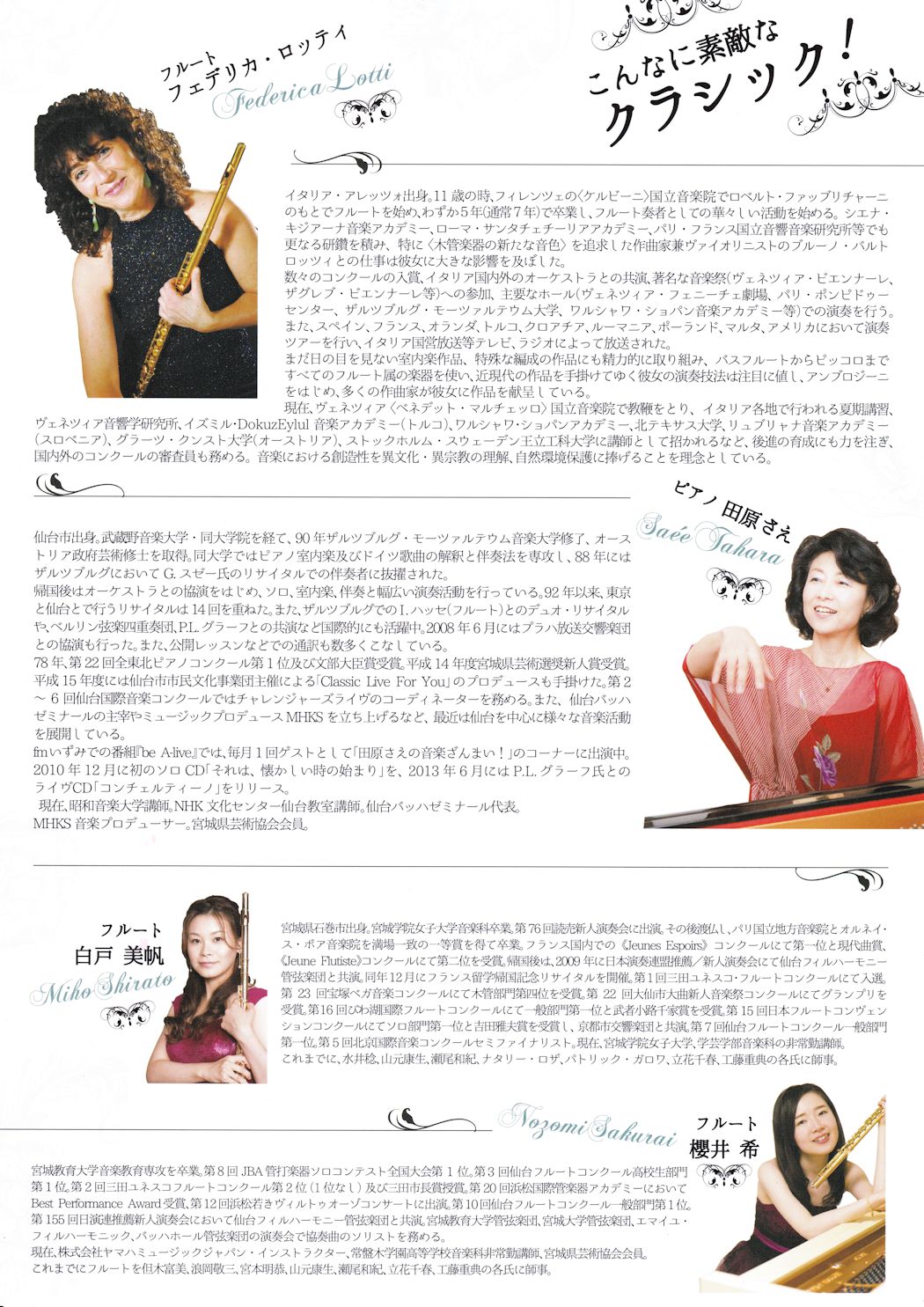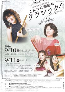 日伊国交樹立150周年を記念してヴェネツィアのフェデリカ・ロッティさん、仙台で大活躍中の白戸石美帆さんと櫻井希さんをお迎えし、フルートの魅力をたっぷりとお楽しみいただきます。前日10日(土)にはフルートアンサンブルワークショップを行います。