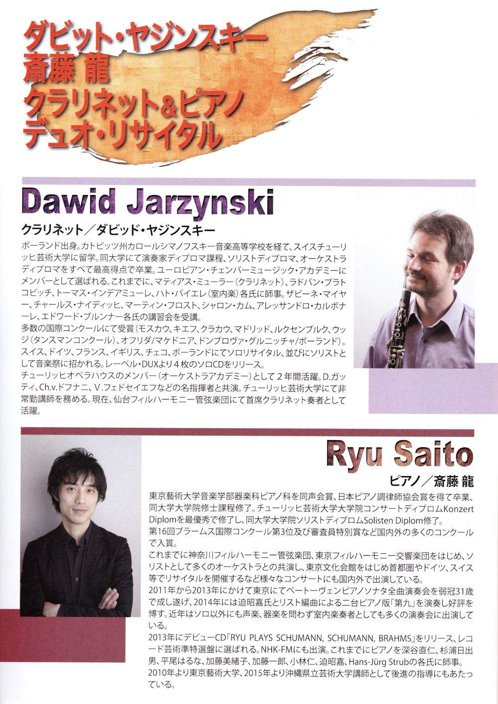 チューリッヒ芸術大学在学中より共演してきた仙台フィル首席クラリネット奏者 ダビット・ヤジンスキーとピアニスト 斎藤龍のデュオによる演奏で、シューマン : 幻想小曲集、 I.ユン: リウル、ヴェルディ=.バッシ: リゴレット幻想曲 他をお聴きいただきます。