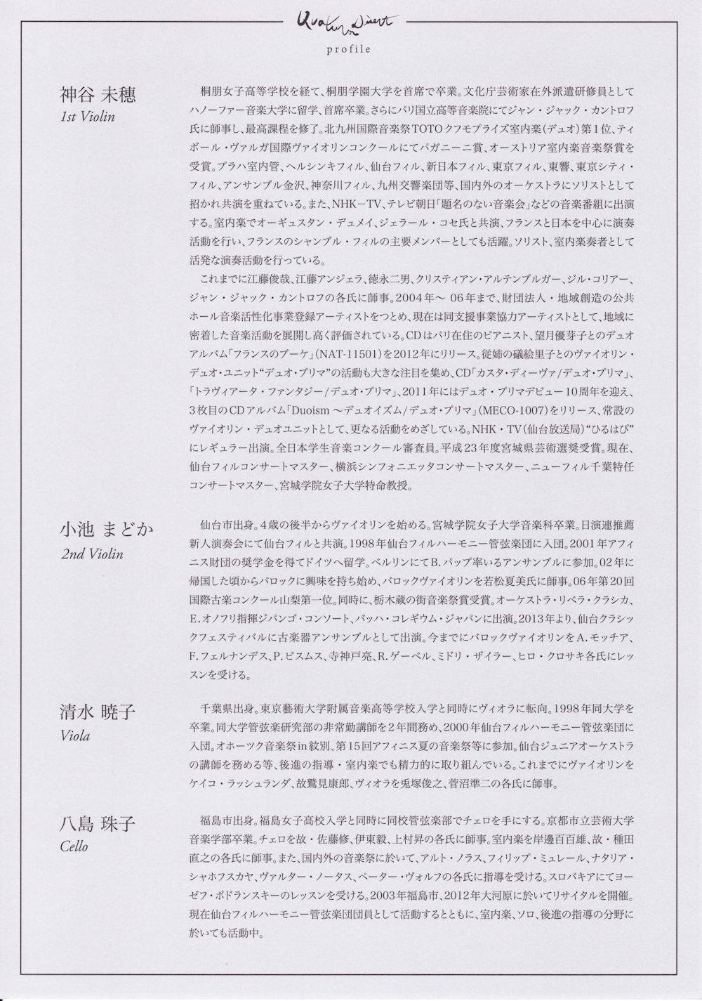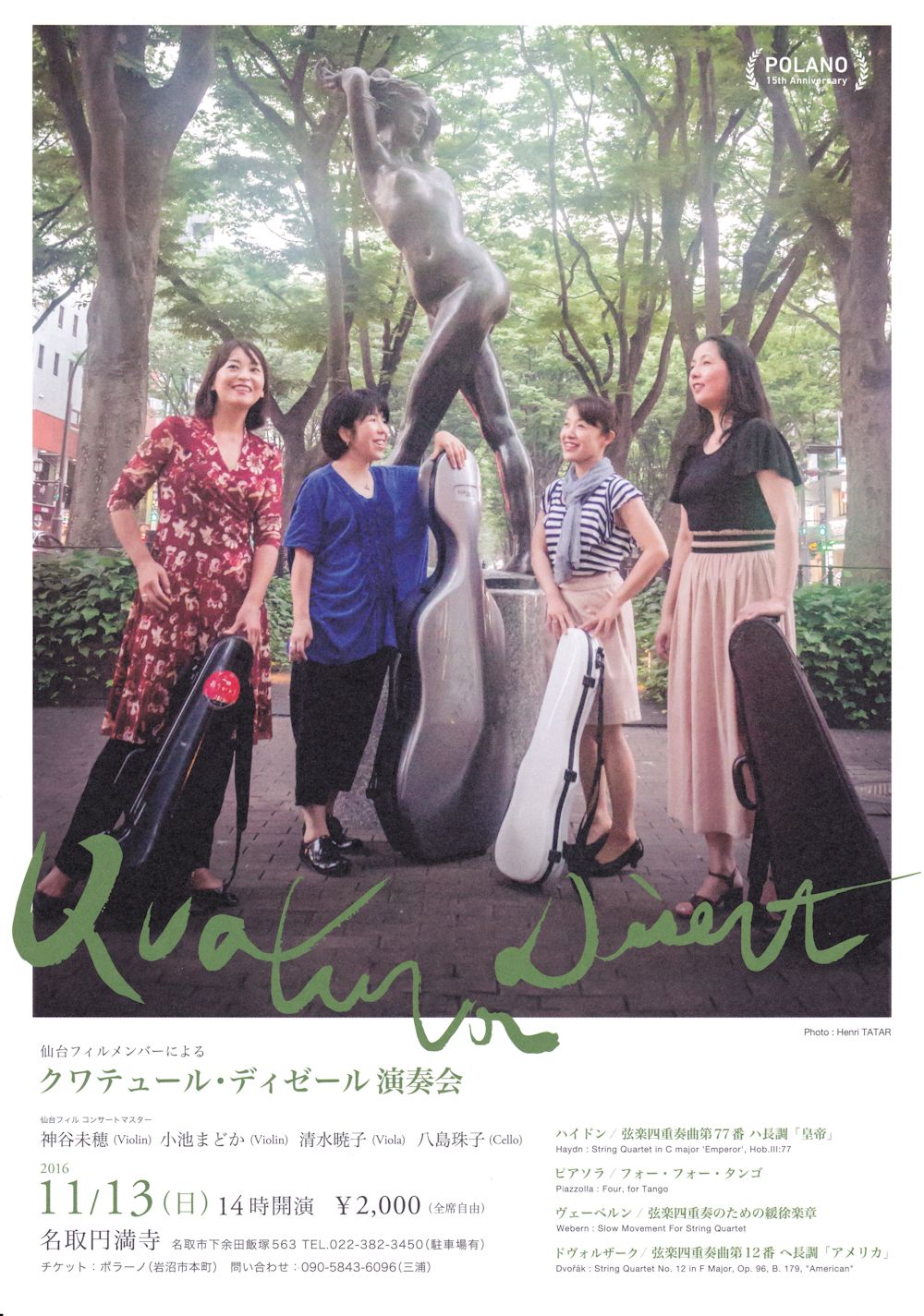 神谷美穂(ヴァイオリン、仙台フィルコンサートマスター)、小池まどか(ヴァイオリン)、清水亜暁子(ヴィオラ)、八島珠子(チェロ)の仙台フィルメンバー4人で構成されるクワテュール・ディゼールの演奏で、ピアソラ「フォー・フォー・タンゴ」、ヴェーベルン「弦楽四重奏曲のための緩徐楽章」、ドヴォルザーク「弦楽四重奏曲 アメリカ」他をお楽しみいただきます。