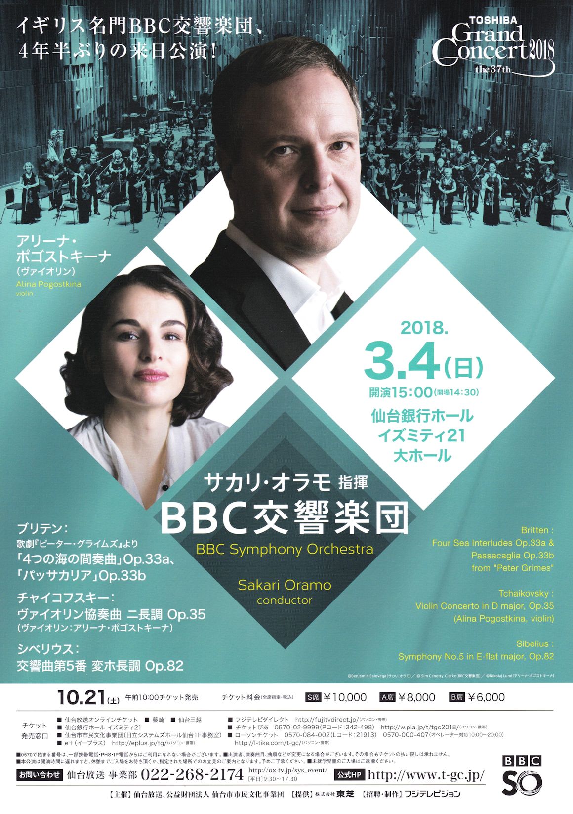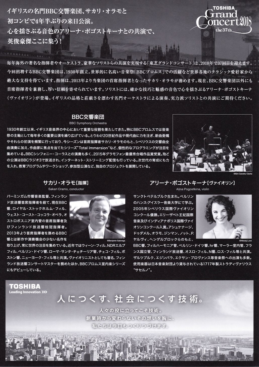 毎年海外の著名な指揮者やオーケストラ、豪華なソリストらの共演を実現する「東芝グランドコンサート」は、2018年で37回目を迎えます。今回招聘するBBC交響楽団は、1930年創立。世界的に名高い音楽祭「BBCプロムス」でめ活躍など世界各地のクラシック愛好家から絶大な支持を得ています。指揮は、2013年より当楽団の首席指揮者となったサカリ・オラモが務めます。現在、BBC交響楽団以外にも首席指揮者を兼務し、厚い信頼を寄せられています。ソリストには、確かな技巧と魅惑の音色で心を揺さぶるアリーナ・ポゴストキーナ(ヴァイオリン)が登場。イギリスの品格と荘厳さを漂わす名門オーケストラによる演奏、実力派ソリストとの共演にご期待ください。