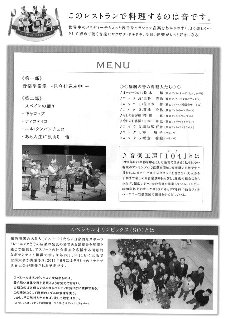 このレストランで料理するのは音です。世界中のメロデイーやちょっと苦手なクラシック音楽をわかりやすく、より楽しく…そして初めて聴く音楽にワクワク・ドキドキ、今日、音楽がもっと好きになる!仙台フィルのメンバーを中心に構成する「音楽工房104」の親子で楽しめるコンサートです!