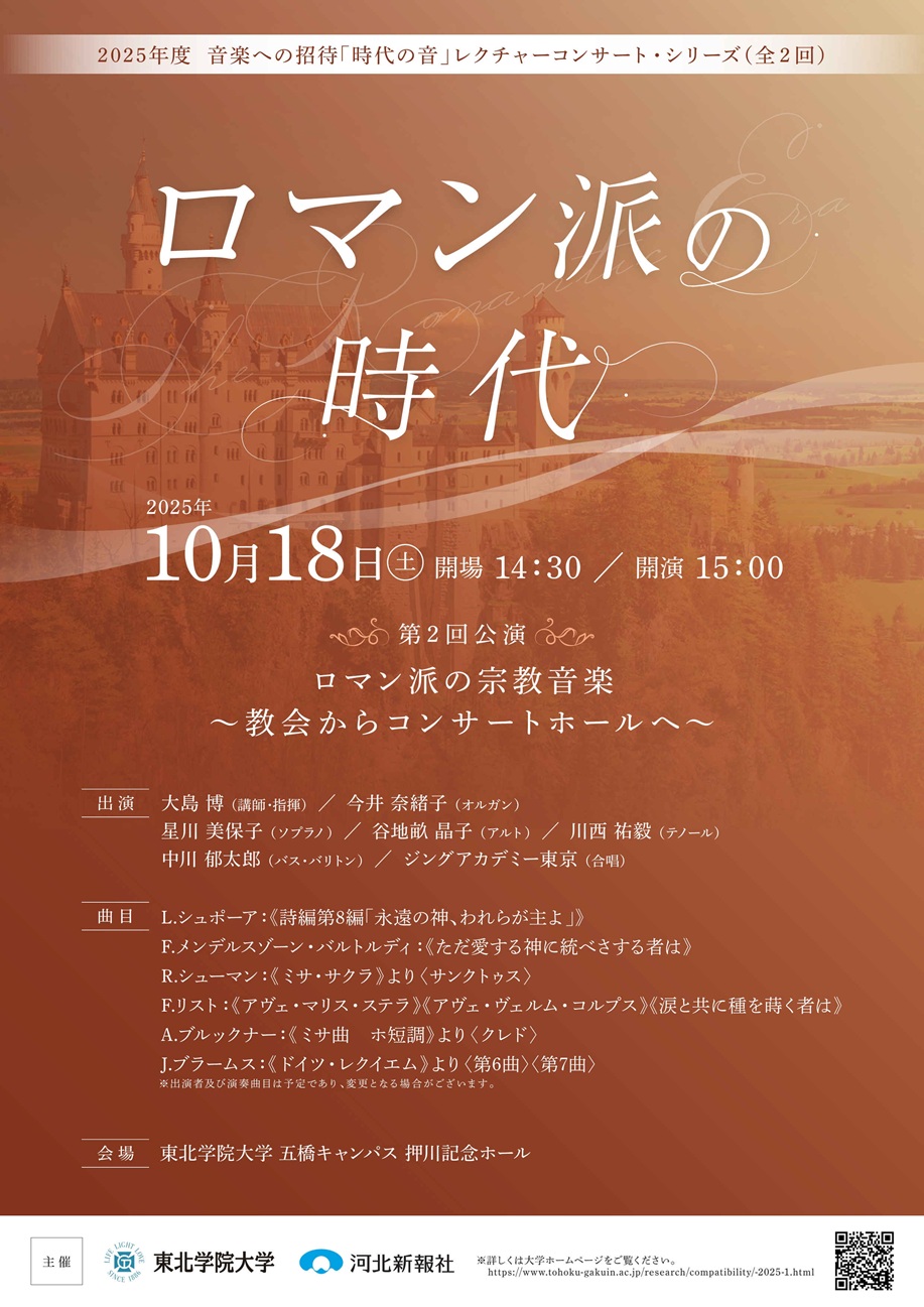 今回は声楽家・合唱指揮者の大島博氏を講師としてお迎えし、シューマンの「ミサ・サクラ」やブラームスの「ドイツ・レクイエム」等の演奏を軸に、伝統的な教会音楽から宗派を超えた宗教的作品へと移行する時代の音楽観や宗教観について解説します。
