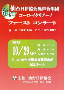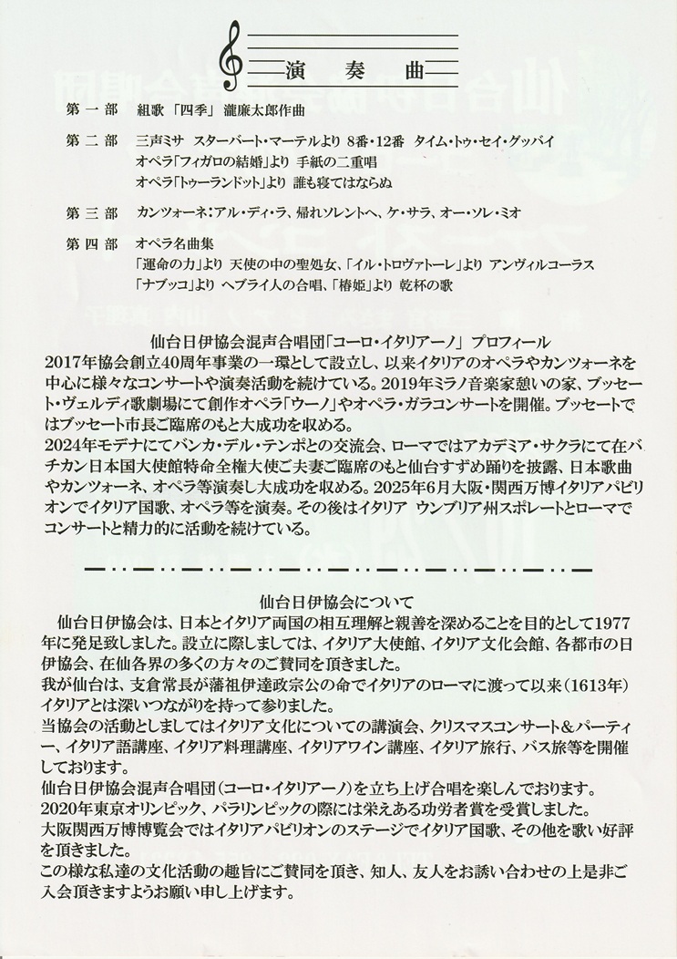 仙台日伊協会創立40周年事業の一環として2017年に設立され、イタリアのオベラやカンツォーネを中心に様々なコンサートや演奏活動を続けている仙台日伊協会混声合唱団「コーロ・イタリアーノ」が、カンツォーネ、オペラ名曲集などを披露します。指揮は三野宮まさみ、ピアノは山内真理子。