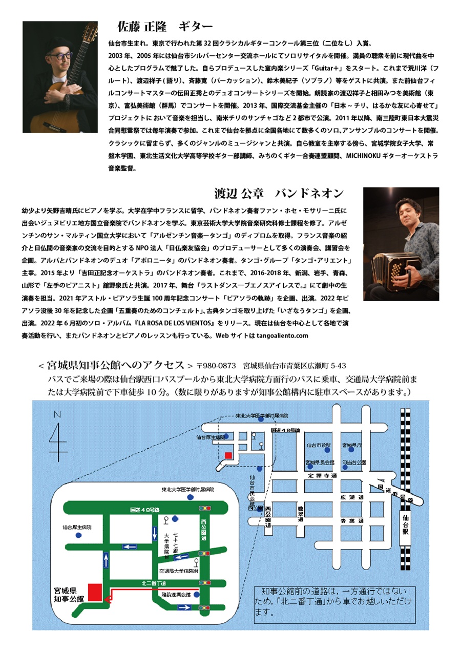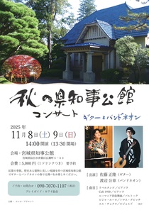 恒例となりました、宮城県知事公館での演奏会を11月8日(土)9日(日)に開催いたします。今回は、先日初公演をし、好評を博したタンゴ五重奏団「キンテート・エコー」のメンバーでもある、ギター奏者の佐藤正隆さんを迎え、ギターとバンドネオンの編成で演奏いたします。紅葉の季節、美しい庭園のある歴史的な洋館でギターとバンドネオンの調べをお楽しみください。