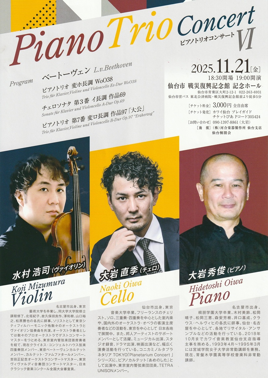 トリオ結成以来、ベートーヴェンのピアノトリオ第1番から始まり、第3番までの作品を全てお聴きいただきました。昨年は雰囲気を変え、ドビュッシーとフォーレの作品を取り上げ、ご高評をいただきましたが、今回は再度ドイツ語圏の音楽に戻り、しかも、全てベートーヴェンの作品にて構成いたしました。