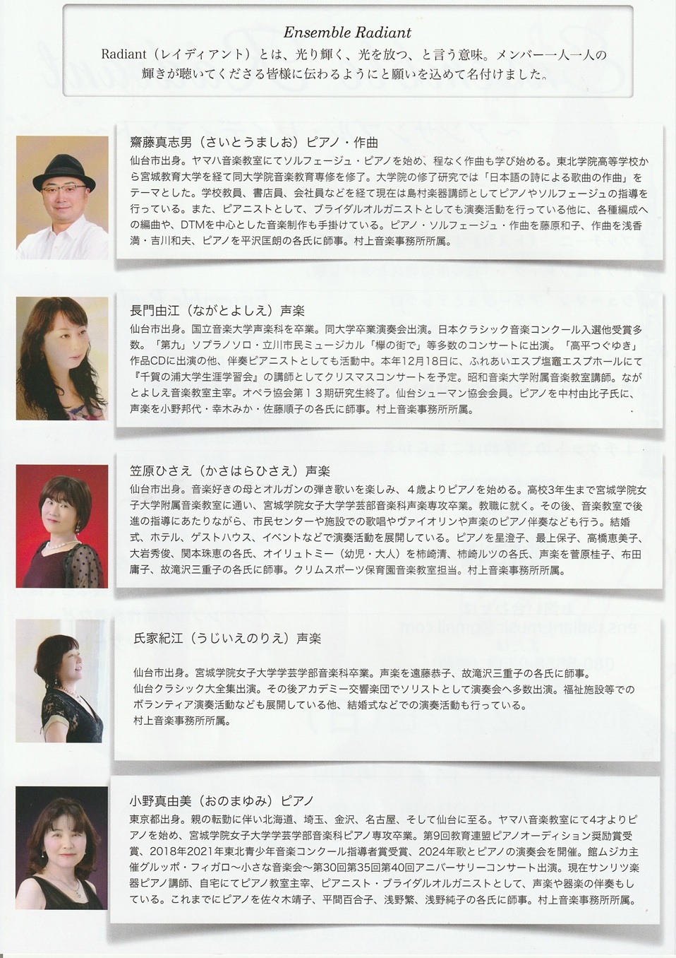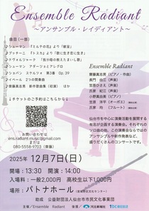 仙台市を中心に演奏活動を展開する有志が企画する演奏会。それぞれのソロ曲の他、この演奏会ならではのアンサンブルや新作発表など、盛りだくさんのコンサートです。Radiant(レイディアント)とは、光り輝く、光を放つ、と言う意味。メンバー一人一人の輝きが聴いてくださる皆様に伝わるようにと願いを込めて名付けました。
