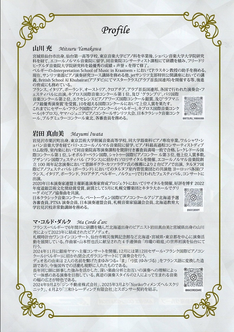 マ・コルド・ダルクは、2023年に北海道出身のピアニスト岩田真由美と宮城県出身のピアニスト山川充によって結成されたピアノデュオ。東京・仙台・札幌を拠点に精力的に演奏活動をしています。今回は、それぞれのソロステージと、4手連弾によるラヴェル「ラ・ヴァルス ニ長調」お楽しみいただきます。