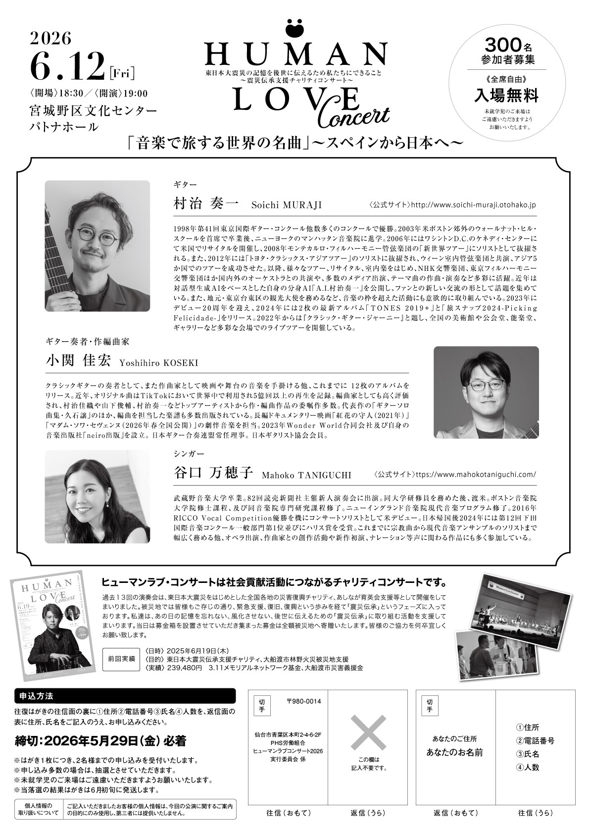 今年で14回目となるヒューマンラブコンサートは、地域への社会貢献の一環としてパナソニックハウジングソリューションズ労働組合が主催するチャリティコンサートです。今回はギタリスト村治奏一さんらをお招きしての開催です。東日本大震災の被災地では皆様もご存じの通り、緊急支援、復旧、復興という歩みを経て「震災伝承」というフェーズに入っております。私達は、あの日の記憶を忘れない、風化させない、後世に伝えるための「震災伝承」に取り組む活動を支援してまいります。当日は募金箱を設置させていただき集まった募金は全額被災地へ寄贈いたします。皆様のご協力を何卒宜しくお願い致します。