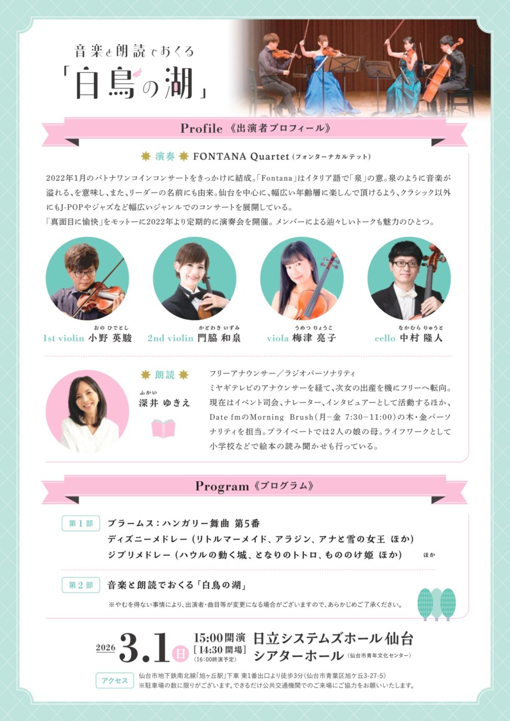 「真面目に愉快」をモットーに2022年より定期的に演奏会を開催しているFONTANA Quartetの演奏と、フリーアナウンサー深井ゆきえの朗読による「白鳥の湖」他をお楽しみいただきます。