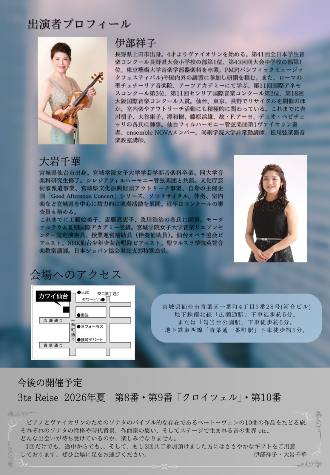 TOP > 仙台・コンサート情報掲示板 > 伊部祥子X大岩千華 ピアノとヴァイオリンのためのソナタ全曲をたどる旅