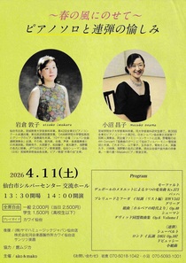 TOP > 仙台・コンサート情報掲示板 > 春の風にのせて ピアノソロと連弾の愉しみ