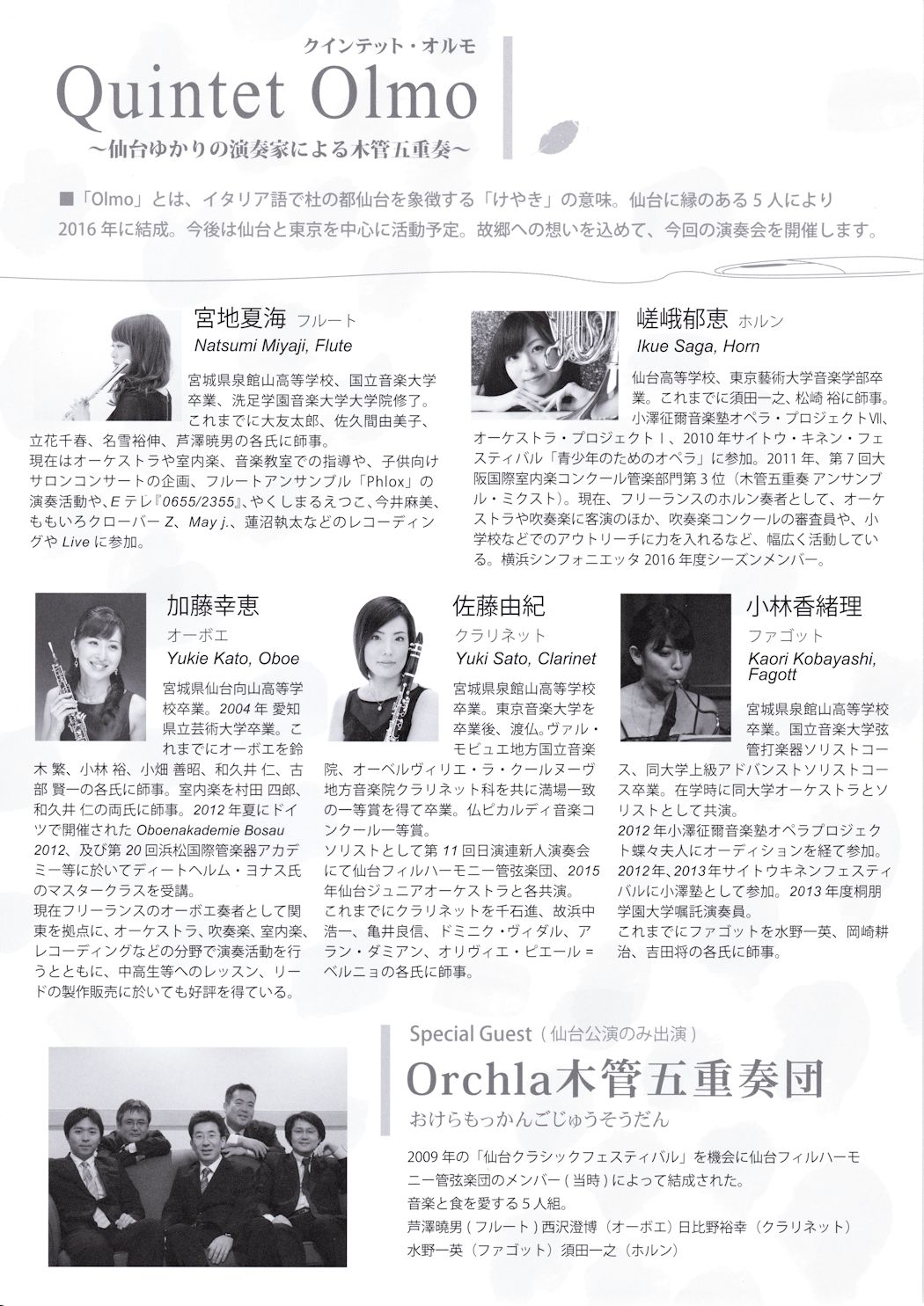 「0lmo」とは、イタリア語で杜の都仙台を象徴する「けやき」の意昧。仙台に縁のある5人によリ2016年に結成。今後は仙台と東京を中心に活動予定。故郷への想いを込めて、今回の演奏会を開催します。