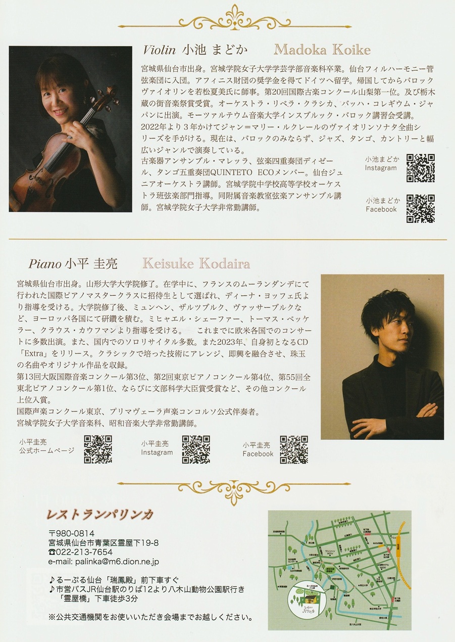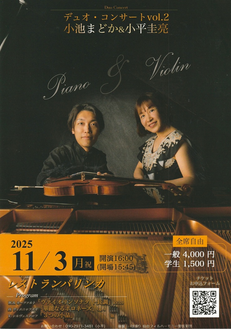 仙台フィルハーモニー管弦楽団第2ヴァイオリン奏者の小池まどかと、仙台出身のピアニスト小平圭亮のデュオによるバロック、古典から現代曲まで多彩なプログラムをお楽しみいただきます。